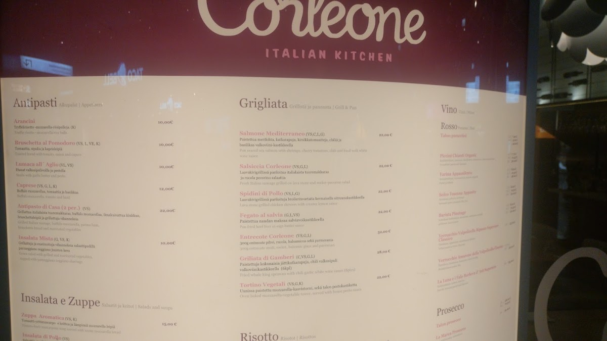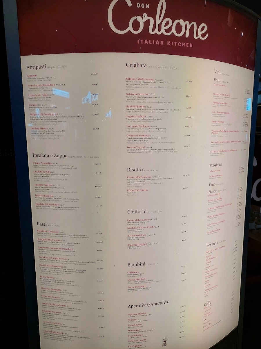 Ravintola Don Corleone offers a menu that balances traditional Italian homestyle dishes with approachable, everyday comfort. The selection feels inviting, featuring hearty pastas, rich risottos, and classic dishes like Carbonara and Mama’s Meatballs. Whether stopping by for a relaxed lunch or a casual dinner after shopping, the menu complements the warm yet unpretentious atmosphere of the restaurant.